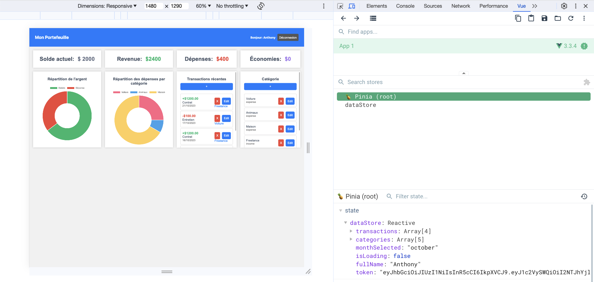 Mon portefeuille est une application web de gestion des dépenses. Elle permet à l'utilisateur de consigner toutes ses entrées et sorties d'argent afin d'obtenir une vue d'ensemble de ses finances. Grâce aux différentes statistiques et graphiques proposés, il peut suivre et analyser ses transactions. Les données de transaction sont stockées pour être consultées ultérieurement