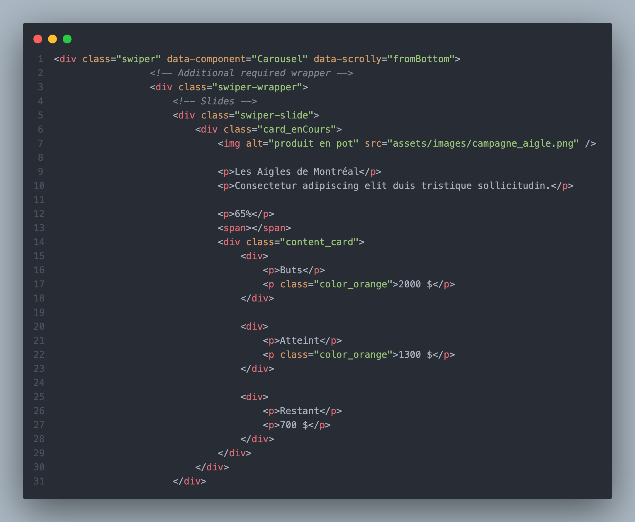 Le site web intègre un composant de carrousel pour afficher les différentes campagnes en cours ainsi que les produits disponibles. De plus, une modal est également disponible pour en savoir davantage sur chaque produit.