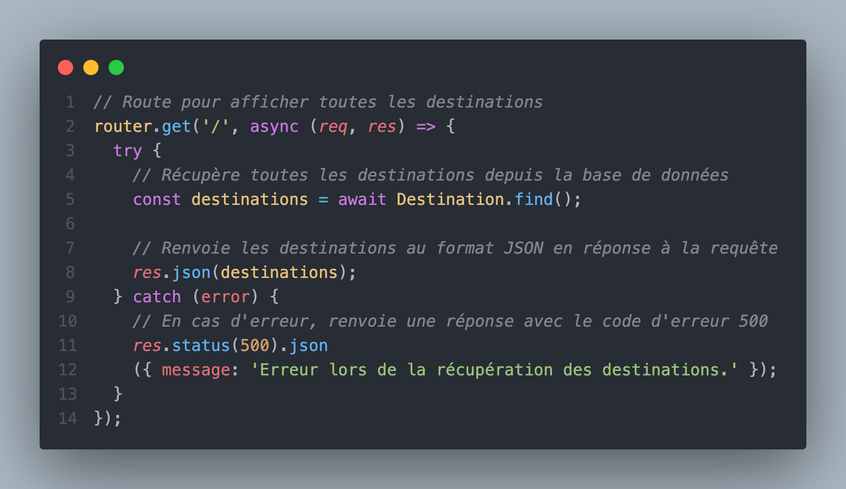J'ai utilisé le framework Express.js pour créer une API REST depuis zéro. Cette API communique avec l'application pour transmettre les données des destinations, gérer l'enregistrement des réservations dans une base de données, et traiter les paiements via Stripe.